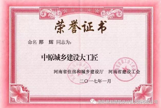 近日,河南省住房和城鄉(xiāng)建設(shè)廳、河南省建設(shè)工會公布了“關(guān)于命名2016年中原城鄉(xiāng)建設(shè)大工匠”的評選結(jié)果,我公司第一城鄉(xiāng)規(guī)劃院院長邢輝、第二建筑設(shè)計院院長張松杰兩位同志獲此殊榮。