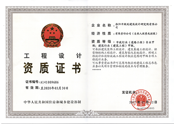 公司市政工程設計專業(yè)1993年經(jīng)中華人民共和國建設部批準獲得市政工程設計乙級資質(zhì),幾十年來,公司市政工程設計專業(yè)為洛陽市和周邊地區(qū)的經(jīng)濟建設作出了較大的貢獻。近年來,公司領(lǐng)導審時度勢推出了大市政的發(fā)展戰(zhàn)略,努力打造一流市政設計隊伍、創(chuàng)造一流品牌、實施一流的服務。在注重市政工程設計產(chǎn)品的質(zhì)量和市政設計業(yè)務發(fā)展的同時,還注重專業(yè)人才梯隊建設,吸收了包括研究生在內(nèi)的大批專業(yè)技術(shù)人才。并嚴格按照ISO9001《質(zhì)量管理體系》要求狠抓市政工程設計產(chǎn)品質(zhì)量,市政工程設計成果連續(xù)多年獲省級獎項,為河南省特別是洛陽的城市建設和經(jīng)濟發(fā)展作出了突出的貢獻。