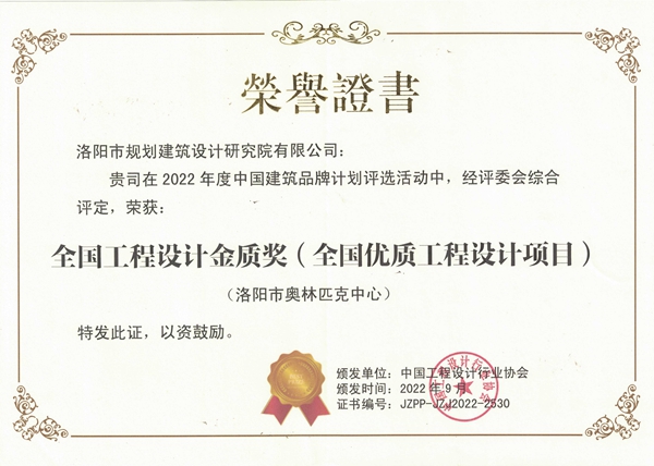洛陽市奧林匹克中心項目榮獲全國工程設(shè)計金質(zhì)獎
