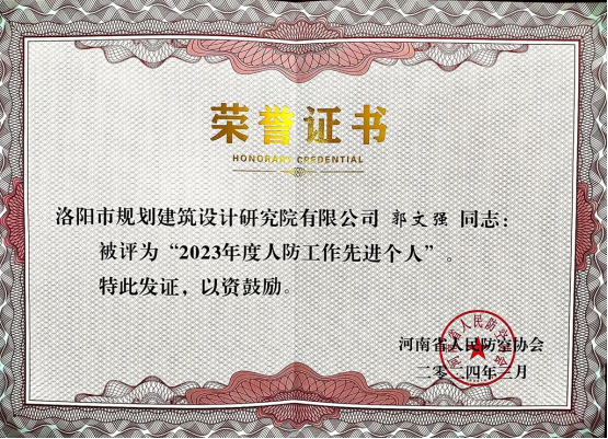 2024年3月15日,河南省人防協(xié)會第四屆二次會員大會在鄭州成功召開。會議旨在促進河南省人防事業(yè)的高質(zhì)量全面發(fā)展,推進會員單位間加強交流,也為了建立更好的戰(zhàn)略型、全面型、服務型平臺。大會表彰了先進單位和先進個人,洛陽市規(guī)劃建筑設計研究院有限公司榮獲河南省人民防空協(xié)會“2023年度人防行業(yè)先進單位”榮譽稱號,郭文強同志獲“2023年度人防工作先進個人”榮譽稱號。